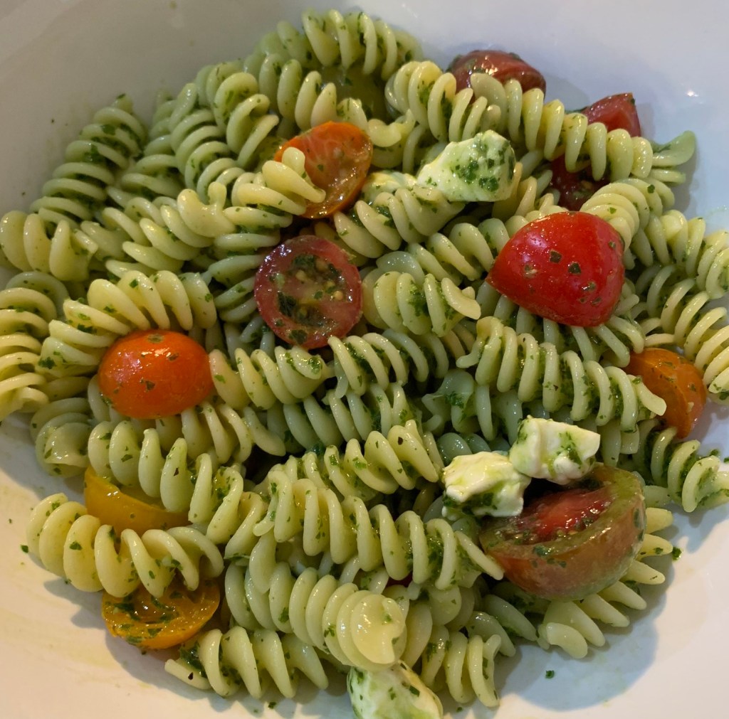 - Add the mozzarella and the pesto to the bowl.