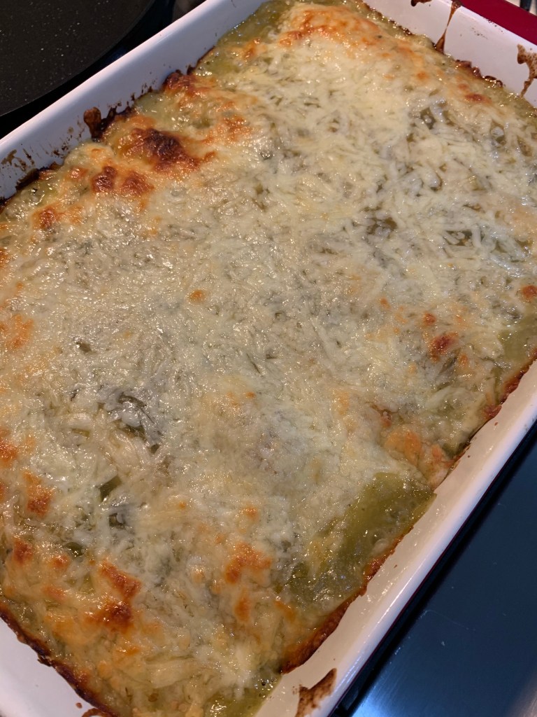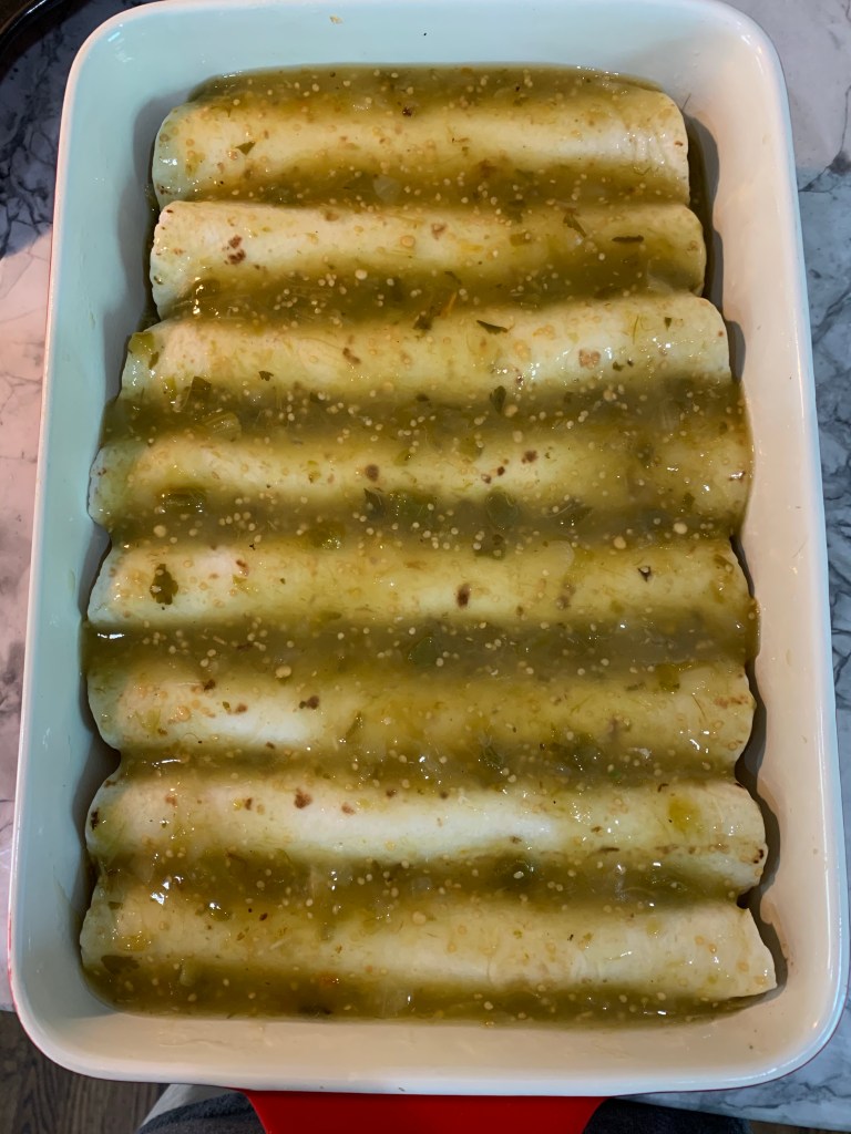 - Cover with remaining salsa verde and Monterey Jack cheese.